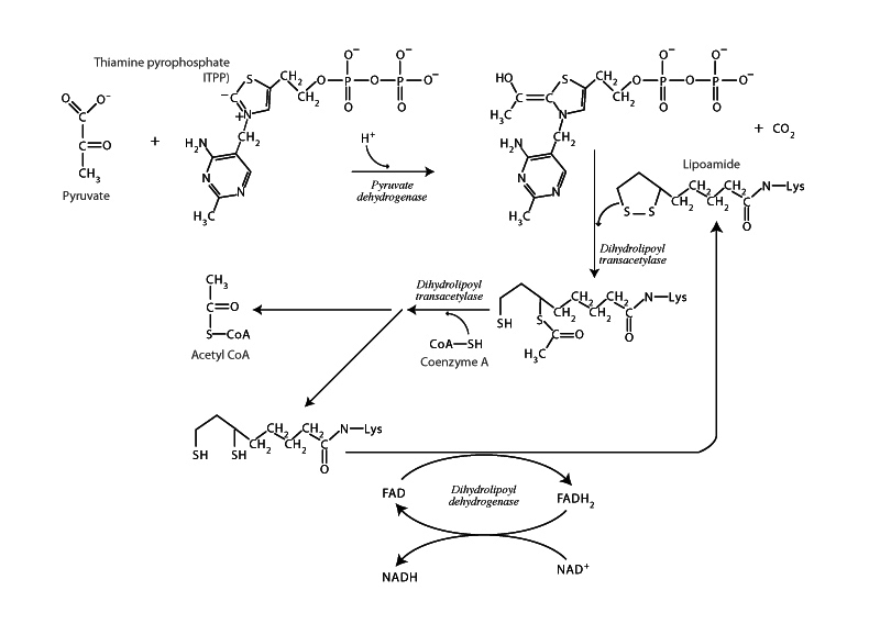 The coenzyme thioamine pyrophosphate (TPP) doesn't actually oxidize the glucose when it cleaves it, liberating CO2. Although the carbon in CO2 now has a +4 oxidation state, which in pyruvate had been +3, control of the electron it lost actually passed to the carbon now attached to TPP. It's oxidation number changed from +2 to +1. The coenzyme that actually removes the electrons from the nutrient carbon will be lipoamide in the next step. When TPP passes the two carbon fragment to lipoamide, the oxidation number of that same carbon changes from +1 to +3, and each of the two sulfurs of lipoamide change in oxidation state from -1 to -2. Two electrons have been transferred from the nutrient carbon, one to each of the sulfur atoms. Carbon has electronegativity of 2.5. Sulfur's is 2.6. This is a nearly level shift in terms of standard reduction potential. The electrons haven't fallen down into a well. They're being held by sulfur at nearly the same energy as in the nutrient.